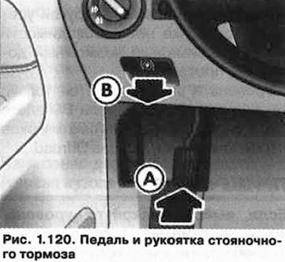Каждый раз при оставлении или парковке автомобиля включайте стояночный тормоз А (рис. 1.120).
