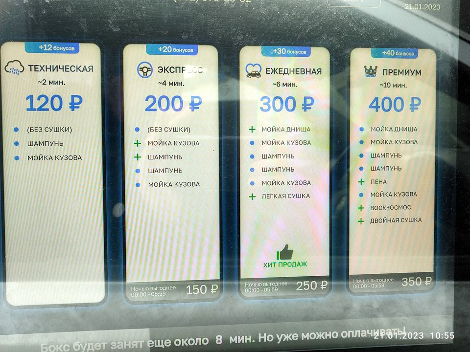 Цена: У них 4 программы помывки. Для новых клиентов первая мойка бесплатно, за последующие придется платить.