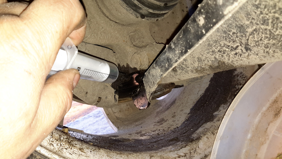 Если состояние пыльника нормальное, и никаких других признаков входа из строя наконечника нет, можно добавить нужное количество смазки при помощи медицинского шприца, проткнув резиновое уплотнение иглой.
