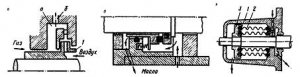 2) В месте выхода вала давление поддерживают немного выше атмосферного, но ниже чем в машине, для чего на валу устанавливают простейший вентилятор1 (рисунок 5 а). В пространстве а воздух из окружающей среды смешивается с газом, и образующаяся смесь удаляется через отверстие б