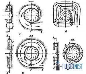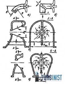 а – угловое колено; б – колено с направляющими лопатками; в – кольцевой подвод; г – двухзаходный полуспиральный подвод