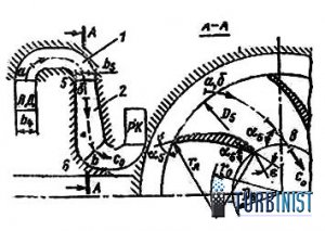 Полуспиральные подводы создают закрутку газа перед входом в рабочее колесо (c1u ≠0) по направлению вращения ротора. Для обеспечения более равномерного распределения скоростей площадь живого сечения а-а подвода выполняется примерно на 50 % больше площади проходного сечения патрубка. Для обеспечения требуемого направления потока в проточной полости кольцевого и полуспирального подводов также могут выполняться неподвижные направляющие лопатки.