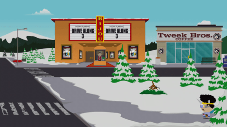Внутри театра Bijou используйте Fartkour, чтобы попасть на верхний уровень. Затем поднимитесь по лестнице на крышу. С помощью Fartkour прыгайте направо, чтобы добраться до крыши Tweek Bros Coffee. Пройдите через люк, чтобы найти плакат.