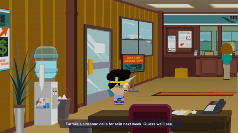 Используйте силу Дружбы Sandblaster, чтобы добраться до банка Южного парка. Постер приклеен к кулеру с водой.