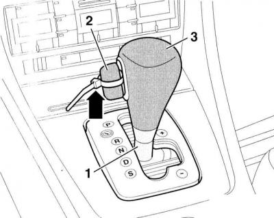 Предупреждение: Для снятия переключателя Tiptronic нажмите внутрь стопоры (2), отсоедините накладку от нижней части и выньте выключатель из накладки.