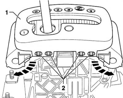 Для снятия переключателя Tiptronic нажмите внутрь стопоры (2), отсоедините накладку от нижней части и выньте выключатель из накладки.
