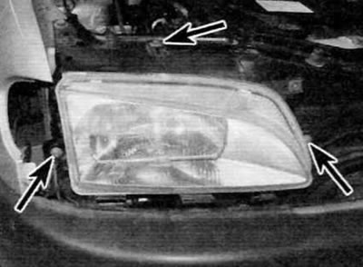Рис. 7.3. Выверните три болта (отмечены стрелками) и снимите фару