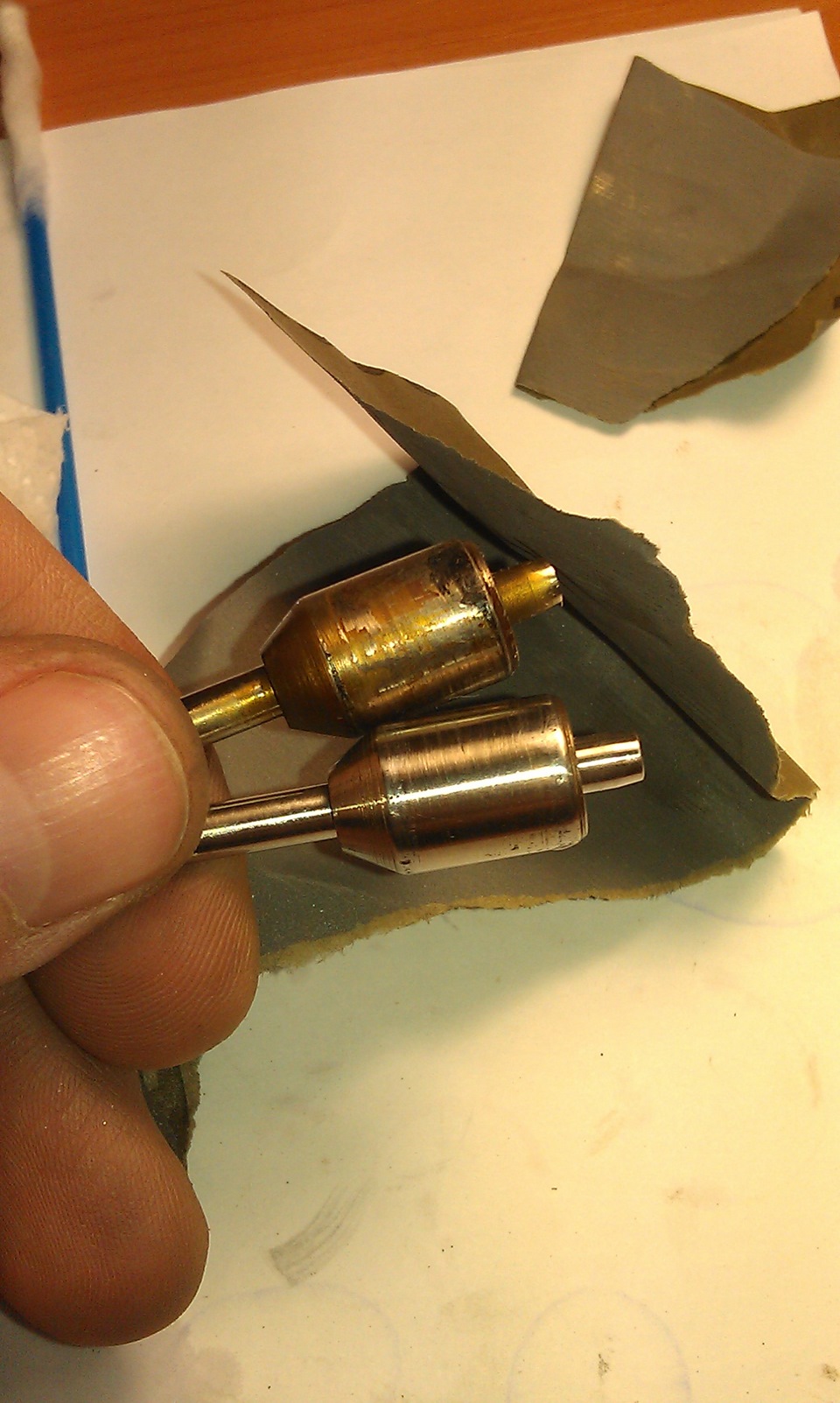 Берем толкатели — и точно так же как и с клапанами обрабатываем их шкуркой, сперва Р800, чтоб снять верхний грубый слой грязи, затем Р2000 для шлифовки и тряпочкой для полировки.