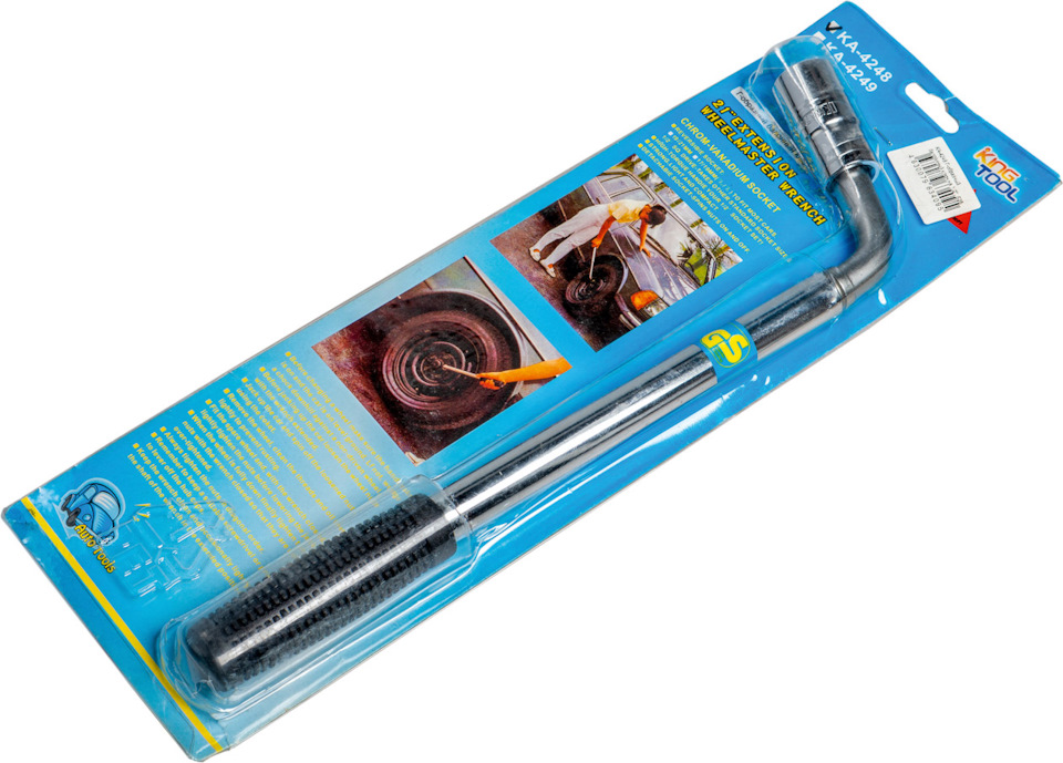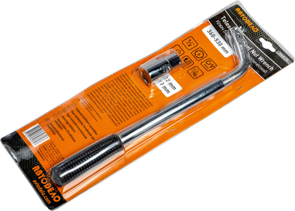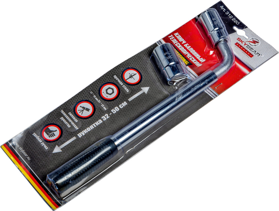 Недорогая телескопическая модель китайского производства выполнена из инструментальной стали. Благодаря использованию последних технических достижений и современных технологий, качество баллонного ключа получилось превосходным. Он прочный и надёжный. Этот вариант можно использовать постоянно. Несмотря на небольшую цену, функциональность и долговечность не пострадала. В составе комплекта — торцевые головки и сам телескопический ключ. Наконечник представляет внутренний 6-гранник. Длина изделия —4,30 см. Стандартные шестигранники — 17, 19, 21, 23. Изготовлен из углеродистой стали 40Х. Изогнутая форма обеспечивает удобство работы с крепежными элементами, находящимися в труднодосягаемых местах.