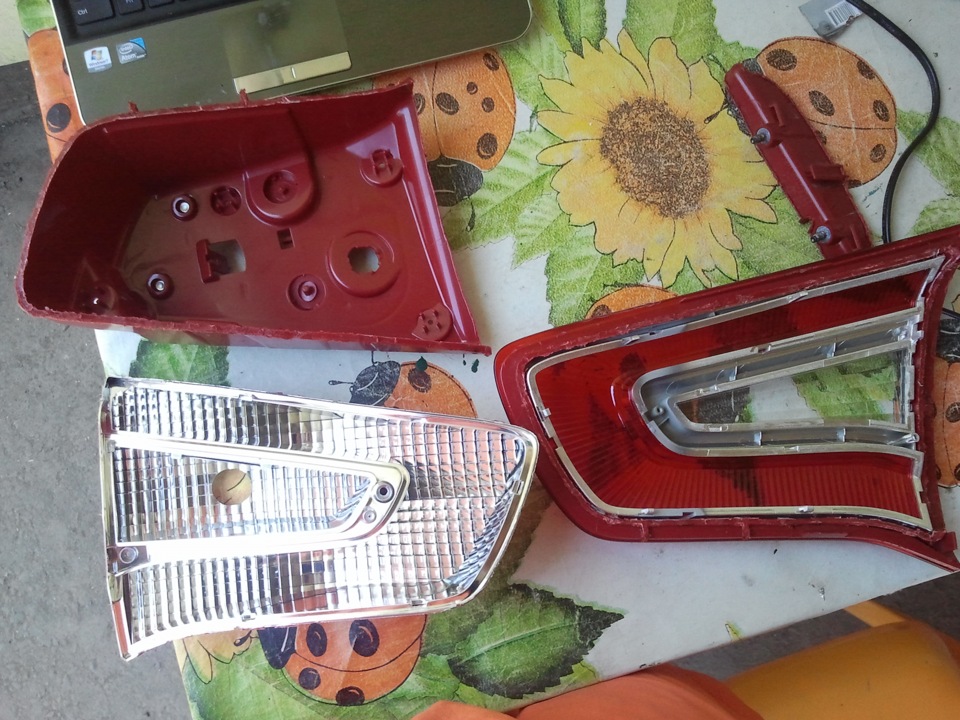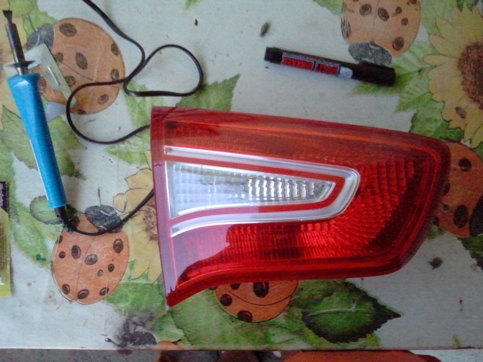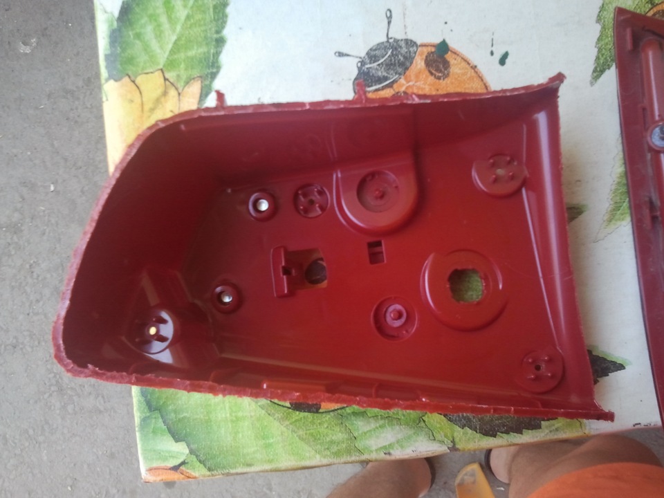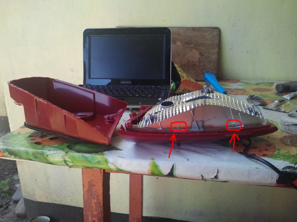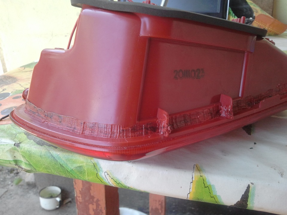 Размечаем на фонаре маркером где будем делать рез паяльником и вперёд, лучше брать по кромке, так как потом будет легче вытаскивать внутренности. Как показано на видео аккуратненько плавим пластмассу и таким образом делаем рез, толщина пластика где-то 2мм, затем когда весь периметр прорезан, аккуратно по углам пытаемся поддевать красную заднюю крышку, если не идёт то смотрим где не дорезали и так аккуратненько она всё-таки нам поддастся =)