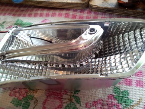 там на отражателе(блестяшке) есть два шурупчика(у меня один оказался, а дырки две), выкручиваем их и аккуратненько, чтоб не сломать нажимаем на защелки по краям и тянем вверх, внимание защелок 6 штук=)