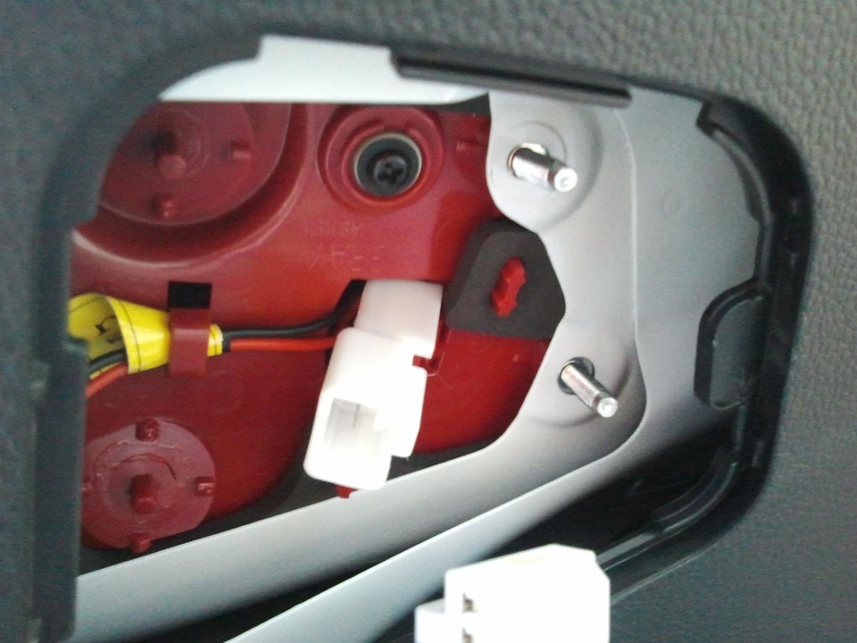 Для начала снимаем разъем на фаре и вместе с ним и лампочку заднего хода, затем откручиваем четыре черных шурупа