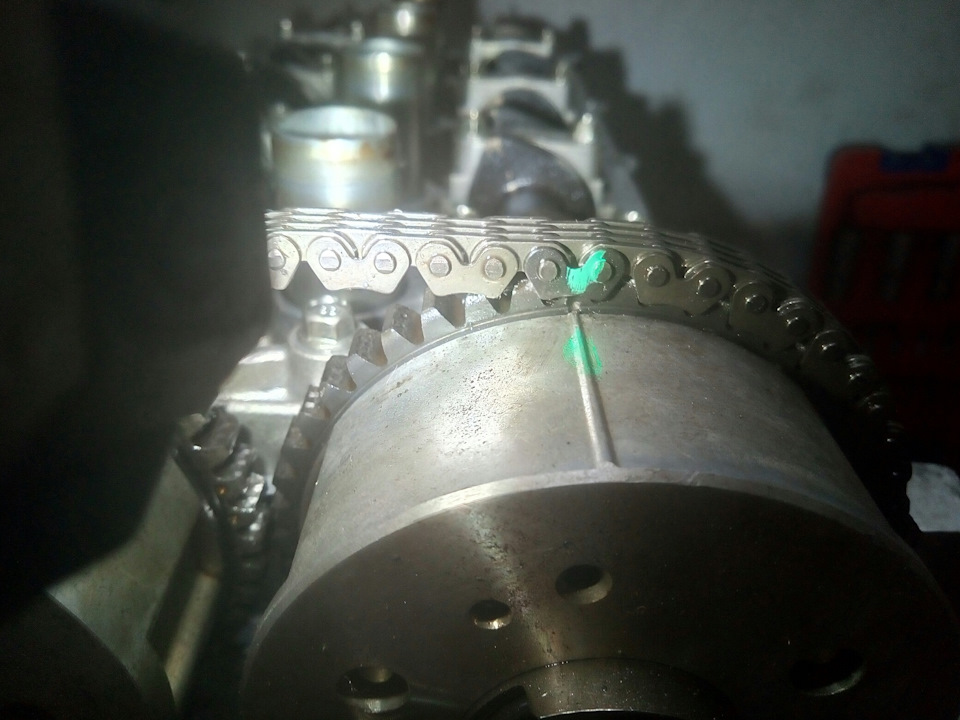 Когда сняли цепь — нельзя крутить распредвалы и коленвал отдельно друг от друга. Если не собираетесь разбирать поршевую — лучше еще до снятия цепи прокрутить коленвал так, чтобы шпонка была строго сверху, а метка (круглая) строго снизу, и только после этого снимать цепь. Если будете менять вкладыши коленвала и/или поршневые кольца — то пофик как он будет.